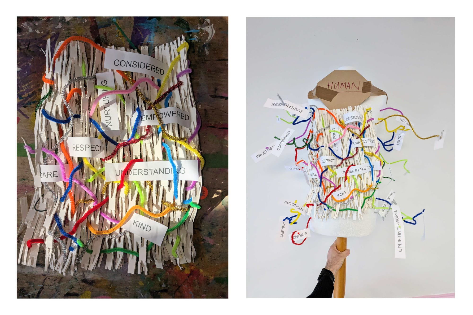 Translating to Language / Visual & Material Concepts | Capturing key themes, words; then shaping these into visual / material representations (sculpture, performance, visuals) and then translating into prose statements (e.g. organisational values). | Bridges the gap between feeling / sensing and shared, actionable identity; helps embed the new values in ways people can see, speak, live. |