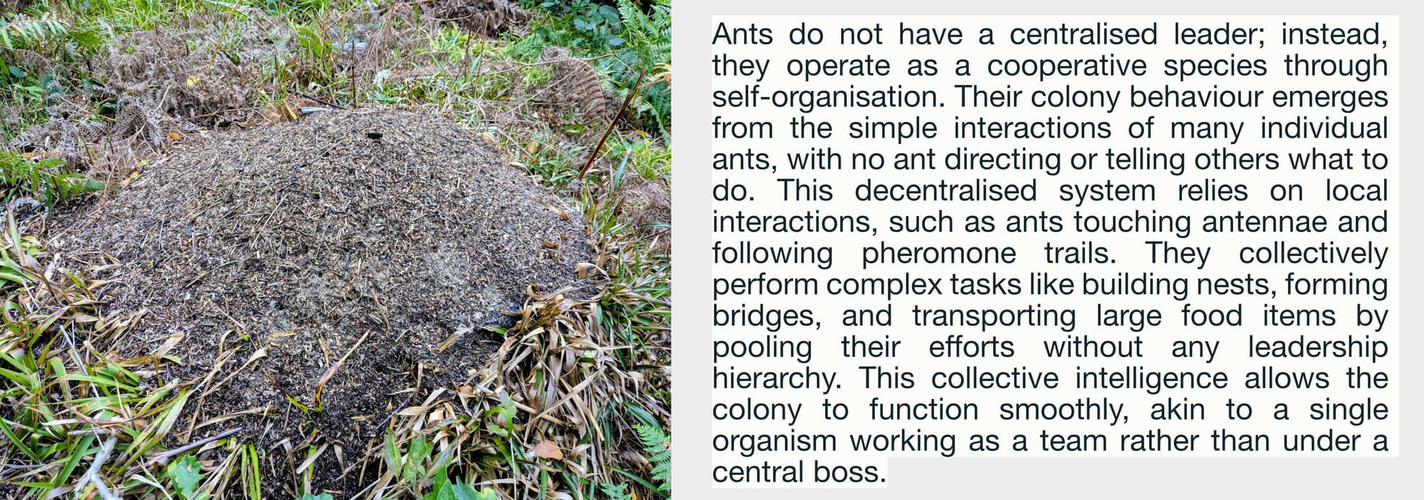 Just like ants we live our politics in, with, and through our bodies, in relationship with others. Looking back on the organising spaces I’ve been part of, I can now see that many of my frustrations were rooted in inherited habits of power: the instinct to control, to lead from the front, to claim expertise. These habits reproduce the very inequities we’re trying to dismantle. I remember one local government training on “building partnerships.” The “expert” stood at the front, reading definitions of what partnerships should be, while the rest of us listened. It looked exactly like school. The potential of the collective, of relational intelligence and lived experience was right there, but left untapped inside a familiar format of authority.